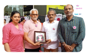 The Indian emblem lion, rendered in the Tanjore painting style with traditional detailing and gold accents, represented inner strength and the courage required to face health challenges head-on. By combining these two symbols, the painting bridged heritage art and public health advocacy.