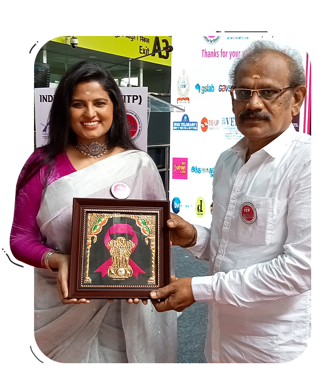 Tanjore painting, known for its rich symbolism, spiritual depth, and use of gold foil, has historically depicted divine and royal themes. For this initiative, we consciously adapted the traditional format to address a modern social cause – breast cancer awareness – while preserving the sanctity and authenticity of the art form.